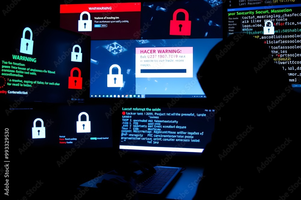 The watermark will not be included on Wall mural.: Amidst a chaotic array of cables and blinking leds, a hacker sits poised for action