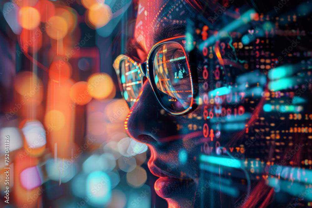 Wall mural an abstract background featuring a software engineer working on a computer, with a line of code refl - Wall murals Wall mural an abstract background featuring a software engineer working on a computer, with a line of code refl - Wall murals