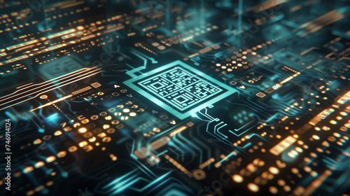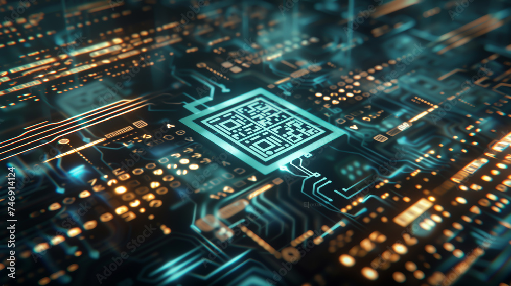 Wall mural an abstract background with a qr code on the computer circuit board. feature used for quick data acc