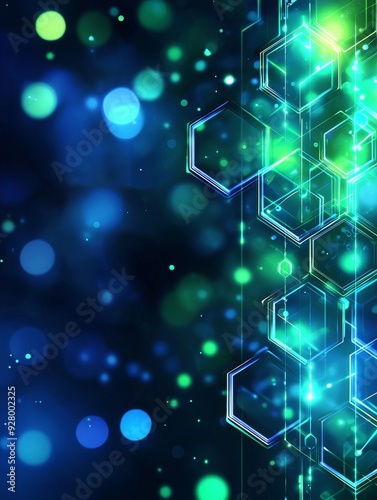 Wall mural an abstract blue and green technology background with hexagons and geometric shapes with blur.