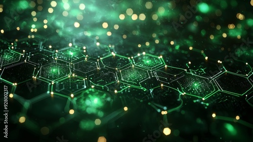 Wall mural an abstract blue and green technology background with hexagons and geometric shapes with blur.