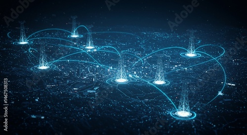 Wall mural : An abstract city map with glowing towers connected by lines, symbolizing communication networks and