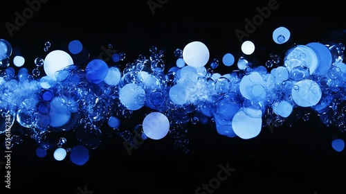 The watermark will not be included on Wall mural.: An abstract composition of blue bubbles and spheres floating against a black background, creating a