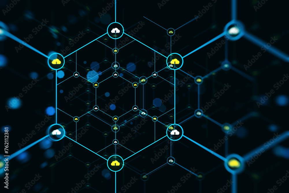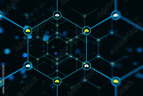 The watermark will not be included on Wall mural.: An abstract digital network with nodes connected by lines on a dark blue background with glowing lig
