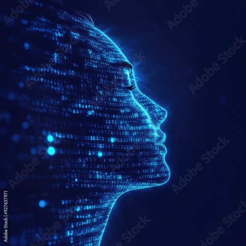 The watermark will not be included on Wall mural.: An abstract glowing digital profile against a deep blue background, with binary code running vertica