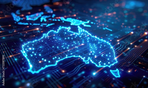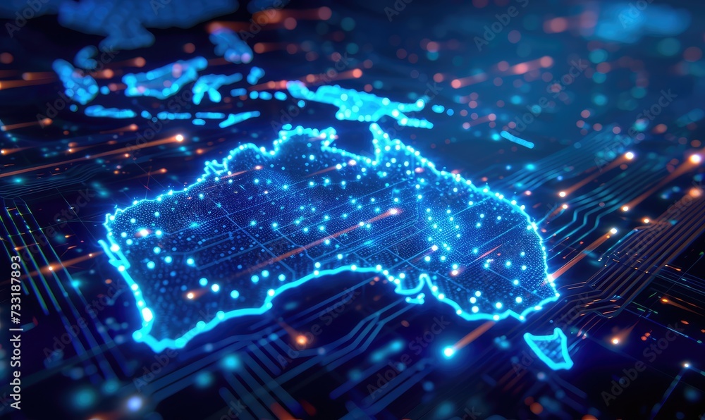 The watermark will not be included on Wall mural.: An abstract image representing the map of australia in a high-tech data flow theme in bright blue co