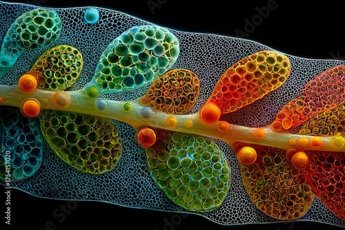 The watermark will not be included on Wall mural.: An abstract macro photography composition featuring colorful organic shapes arranged along a stem, s