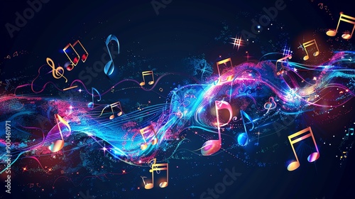 The watermark will not be included on Wall mural.: An abstract musical background with colorful notes and a glowing wave -