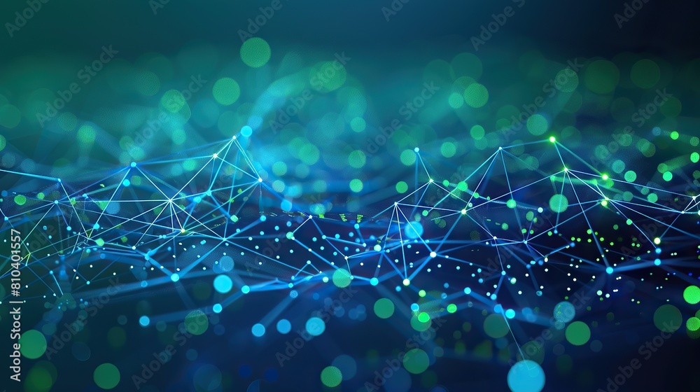 Wall mural an abstract network of blue and green dots connected by neon lines on a dark teal canvas creating a