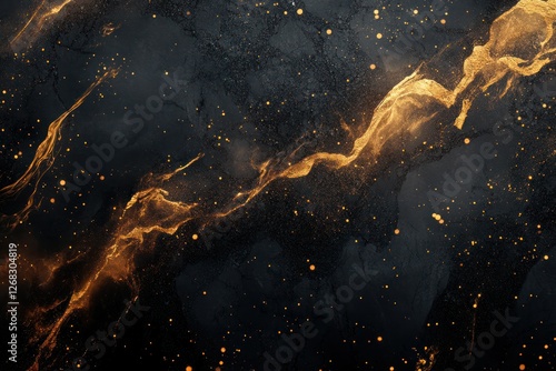 The watermark will not be included on Wall mural.: An abstract pattern of gold fluid ink on a black marble-textured background -
