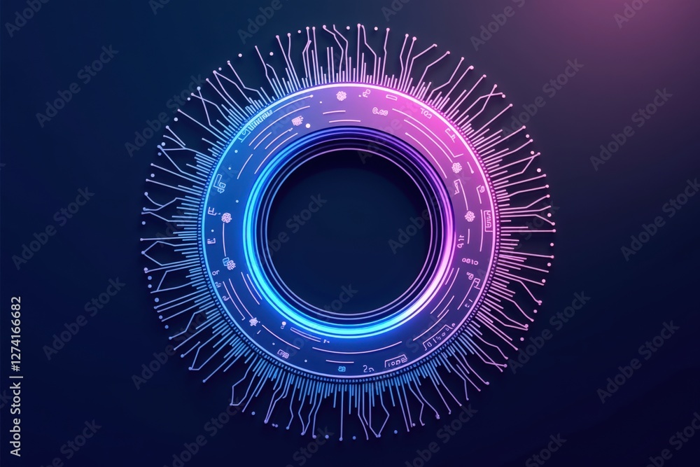 The watermark will not be included on Wall mural.: An abstract representation of a futuristic circular circuit design with vibrant colors highlighting