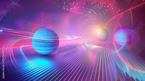 The watermark will not be included on Wall mural.: An abstract space scene with two planets and glowing light trails -