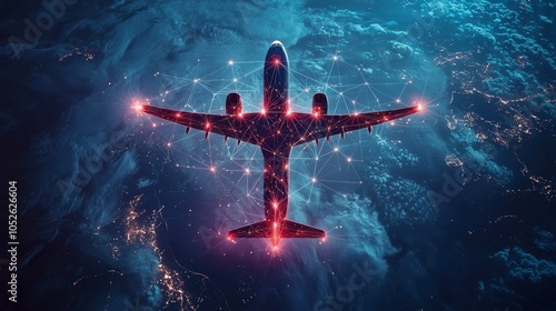 An airplane flying above earth, surrounded by a digital network of glowing red nodes and connectionsWall mural