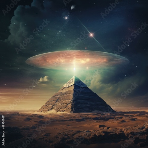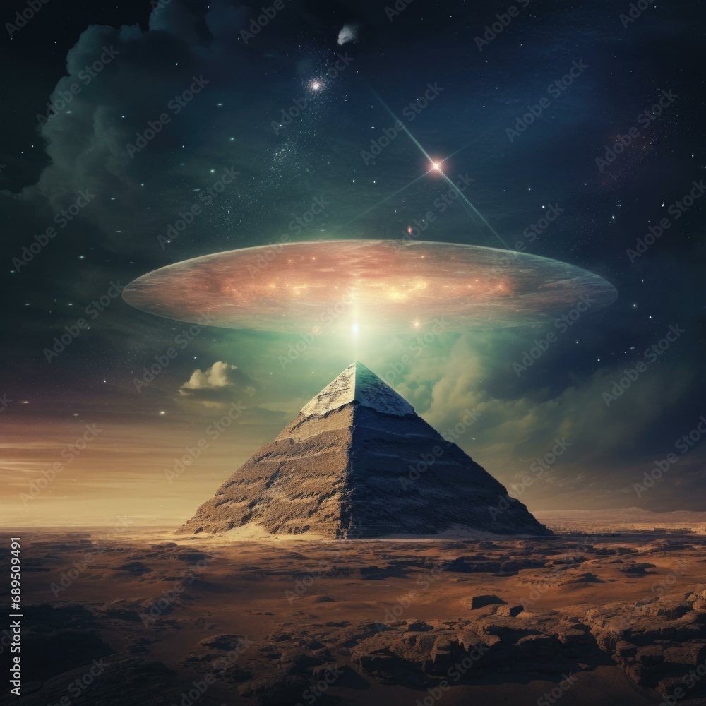 Wall mural an alien spaceship is flying over a pyramid. generative ai. - Wall murals Wall mural an alien spaceship is flying over a pyramid. generative ai. - Wall murals