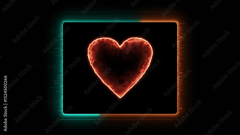 The watermark will not be included on Wall mural.: An animation of glitchy cyan and orange square frame with flaming glowing heart with smokey effects