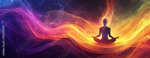 Wall mural an artistic rendering of sound waves cascading through a meditation figure, blending with cosmic ele