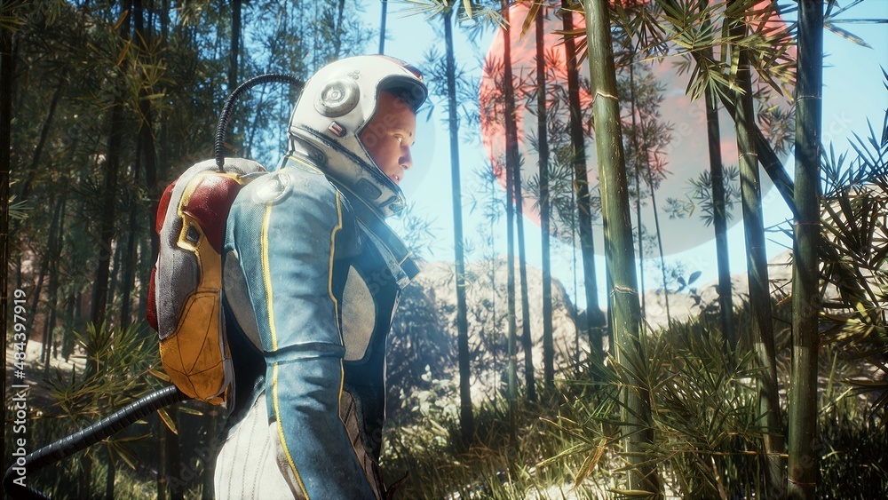 Wall mural an astronaut explorer admires the red moon of an uncharted green planet. the concept of discovering  - Wall murals Wall mural an astronaut explorer admires the red moon of an uncharted green planet. the concept of discovering - Wall murals