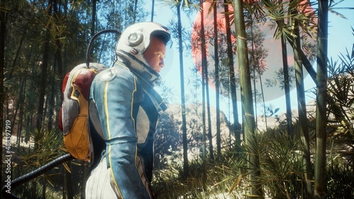 Wall mural an astronaut explorer admires the red moon of an uncharted green planet. the concept of discovering