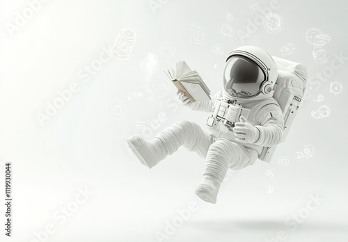 The watermark will not be included on Wall mural.: An astronaut floating in space, reading a book with whimsical illustrations around -