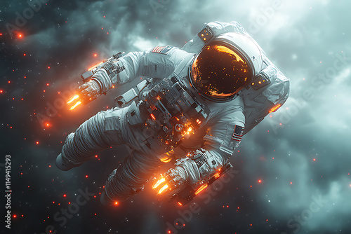 The watermark will not be included on Wall mural.: An astronaut floats in space surrounded by glowing particles and clouds -