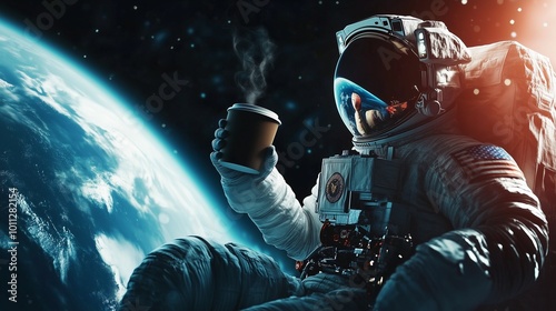 The watermark will not be included on Wall mural.: An astronaut in a spacesuit casually sipping coffee from a floating cup while gazing at earth from t