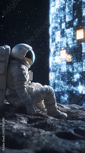 Wall mural an astronaut in a white spacesuit sits on the moon, gazing at a digital structure.