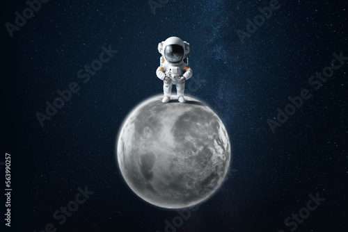Wall mural an astronaut in a white spacesuit standing on the surface of the moon. exploring space and other pla