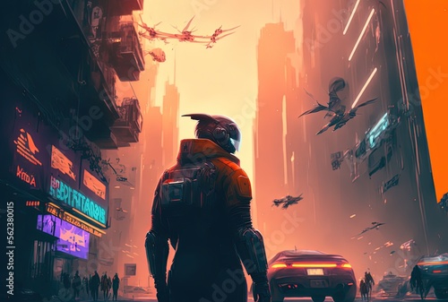 Wall mural : An astronaut in spacesuit stand in front of big building background, idea for sci-fi cyber punk them