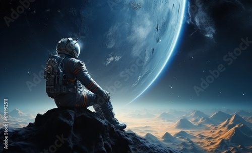 Wall mural : An astronaut is shown in his spacesuit with space on the background
