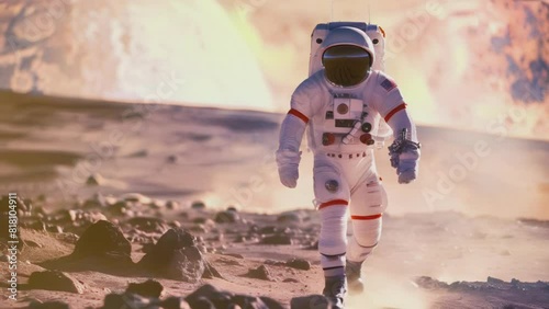 Wall mural an astronaut of the future stands on an unknown alien planet. a man in a spacesuit on an alien plane - Wall murals Wall mural an astronaut of the future stands on an unknown alien planet. a man in a spacesuit on an alien plane - Wall murals