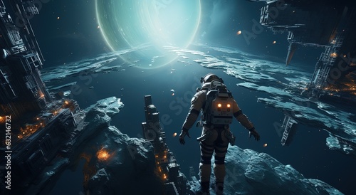 Wall mural an astronaut on an alien planet in front of the light of the space-time portal. exploration of the s