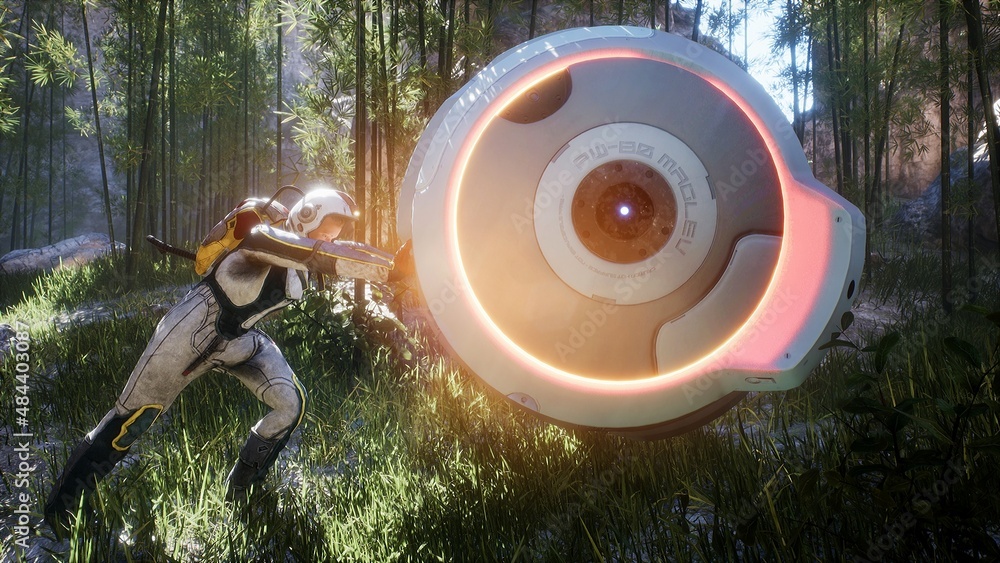 Wall mural an astronaut on an alien planet tries to establish communication with home by drone. the concept of  - Wall murals Wall mural an astronaut on an alien planet tries to establish communication with home by drone. the concept of - Wall murals
