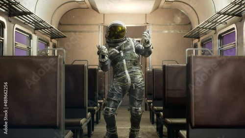 Wall mural an astronaut pointing fingers flies on an interstellar train travelling at superluminal speed. the c - Wall murals Wall mural an astronaut pointing fingers flies on an interstellar train travelling at superluminal speed. the c - Wall murals