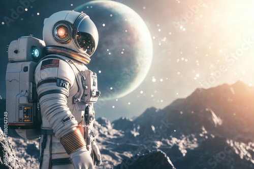 Wall mural an astronaut stands on the surface of a distant planet, wearing a spacesuit and exploring the alien