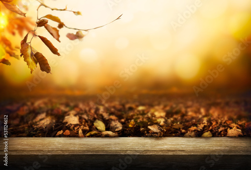 The watermark will not be included on Wall mural.: An autumn golden sunset background of tree leaves and trees in the fall with a wooden nemch, table,