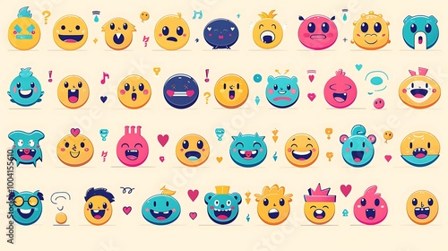 The watermark will not be included on Wall mural.: An emoji design set featuring expressive faces and symbols, perfect for use in messaging apps and di