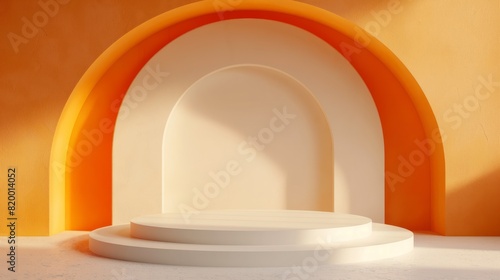 The watermark will not be included on Wall mural.: An empty beige podium on an orange background with an arch - an empty showcase for displaying goods -