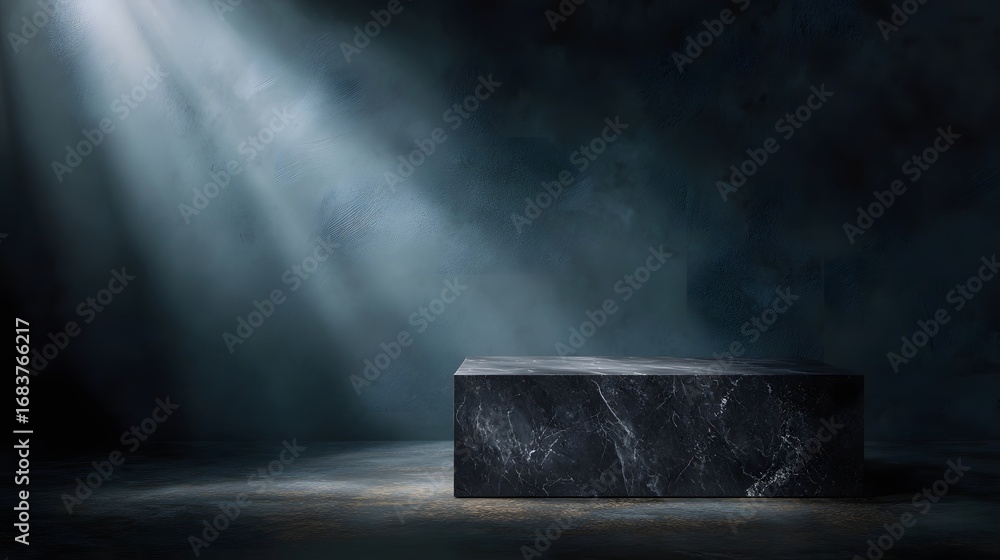 The watermark will not be included on Wall mural.: An empty dark marble platform is dramatically illuminated by ethereal light rays in a minimalist stu