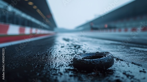 Wall mural : An empty f1 track showcasing a close-up view of a weathered tire on wet asphalt, capturing the atmos