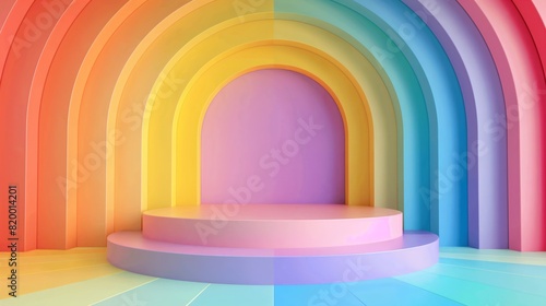 The watermark will not be included on Wall mural.: An empty podium on a multicolored rainbow background, an empty showcase for displaying goods - 3d ren