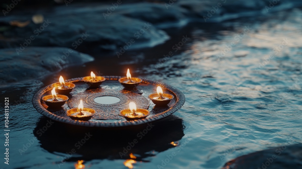 The watermark will not be included on Wall mural.: An empty scene featuring blank mockup template of an offering plate with lit diyas floating down the
