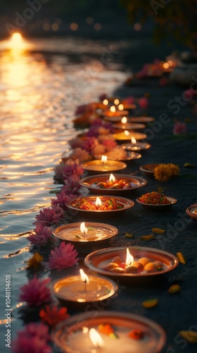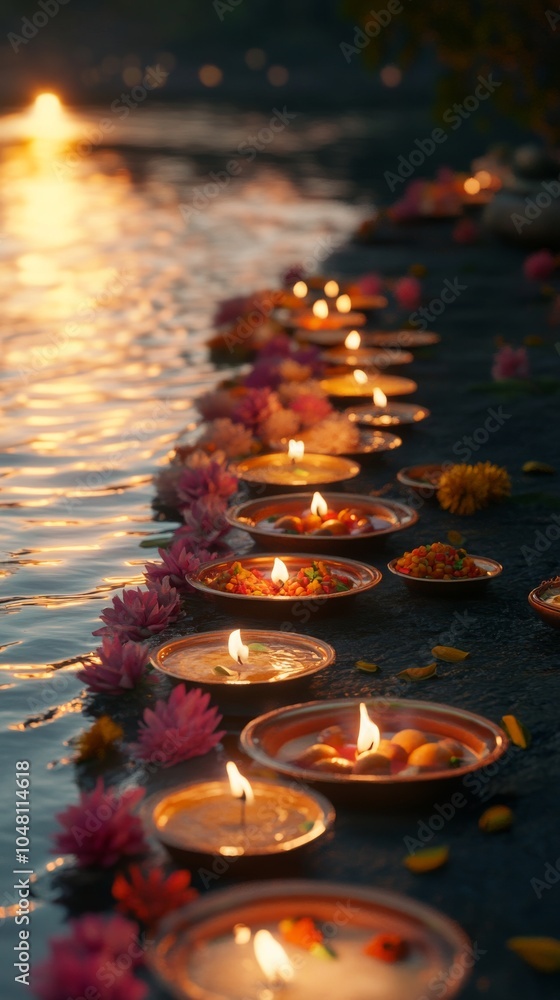 The watermark will not be included on Wall mural.: An empty scene featuring blank mockup template of multiple thalis filled with offerings of fruits, f