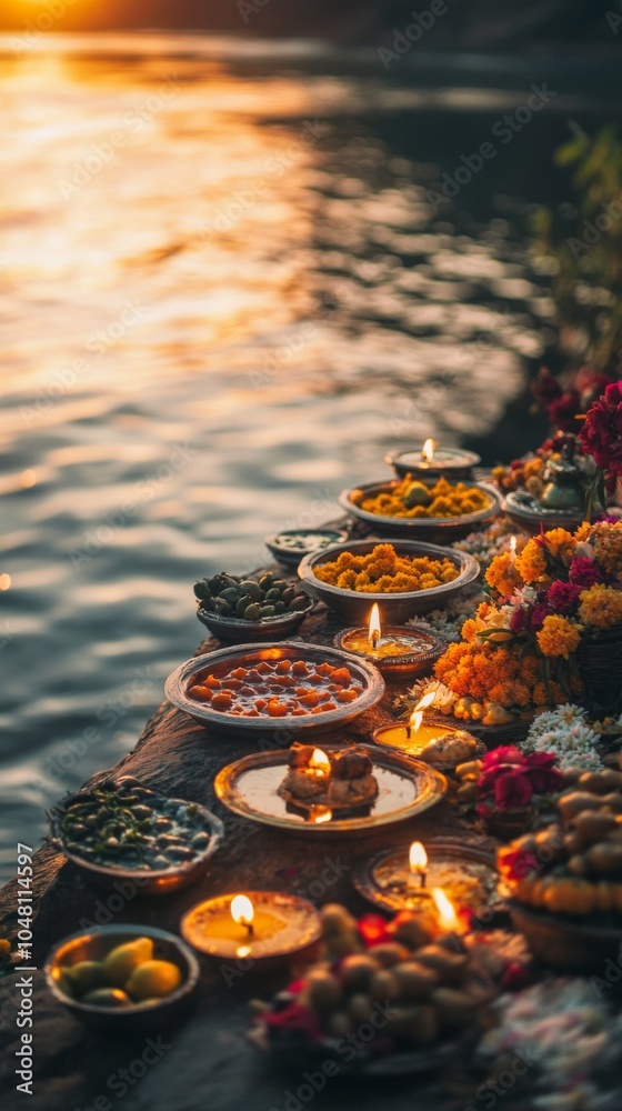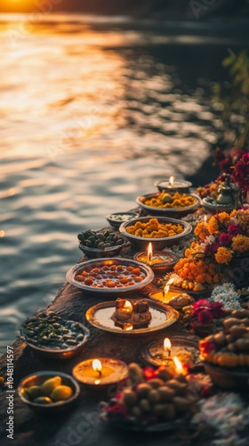 The watermark will not be included on Wall mural.: An empty scene featuring blank mockup template of multiple thalis filled with offerings of fruits, f