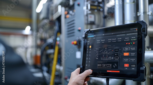 The watermark will not be included on Wall mural.: An engineer programs and controls a robotic arm using a tablet, with the machinery of a high-tech ma