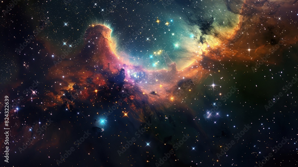 The watermark will not be included on Wall mural.: An ethereal space galaxy scene showcasing a colorful nebula cloud illuminated by twinkling stars aga