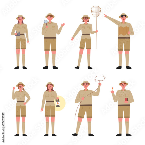 The watermark will not be included on Wall mural.: An explorer character set standing with various equipment - flat design style minimal vector illustra