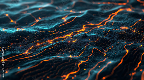 Wall mural an illuminated digital map showcasing glowing waypoints and topography lines over a 3d landscape. - Wall murals Wall mural an illuminated digital map showcasing glowing waypoints and topography lines over a 3d landscape. - Wall murals