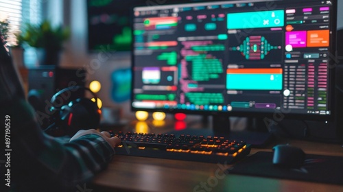 The watermark will not be included on Wall mural.: An illustration of software developer working on computer code at night