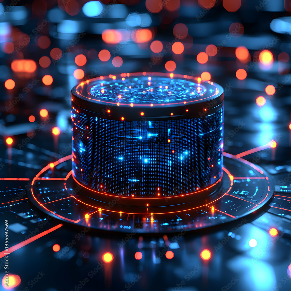 The watermark will not be included on Wall mural.: An image featuring a glowing cylindrical data center with a technological aesthetic - ideal for illus