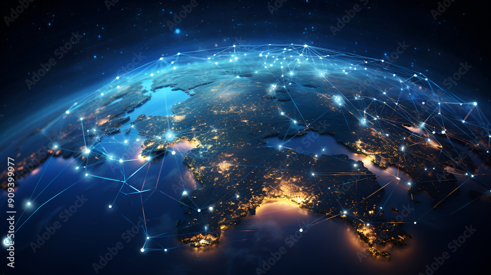 The watermark will not be included on Wall mural.: An image of the globe seen from outer space, illuminated by network lines and nodes that depict conc